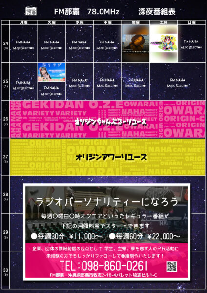 FM那覇2026年2月度番組表更新のお知らせ 2026年2月6日 お知らせ FM那覇2026年2月度番組表を更新しました 【新番組】 毎週土曜日16:30~16:56 長野廉・上地完太は僥倖である 毎週土曜日20:30~20:56 8ポケでオールイン 毎週日曜日15:30~15:56 フローライフラジオ